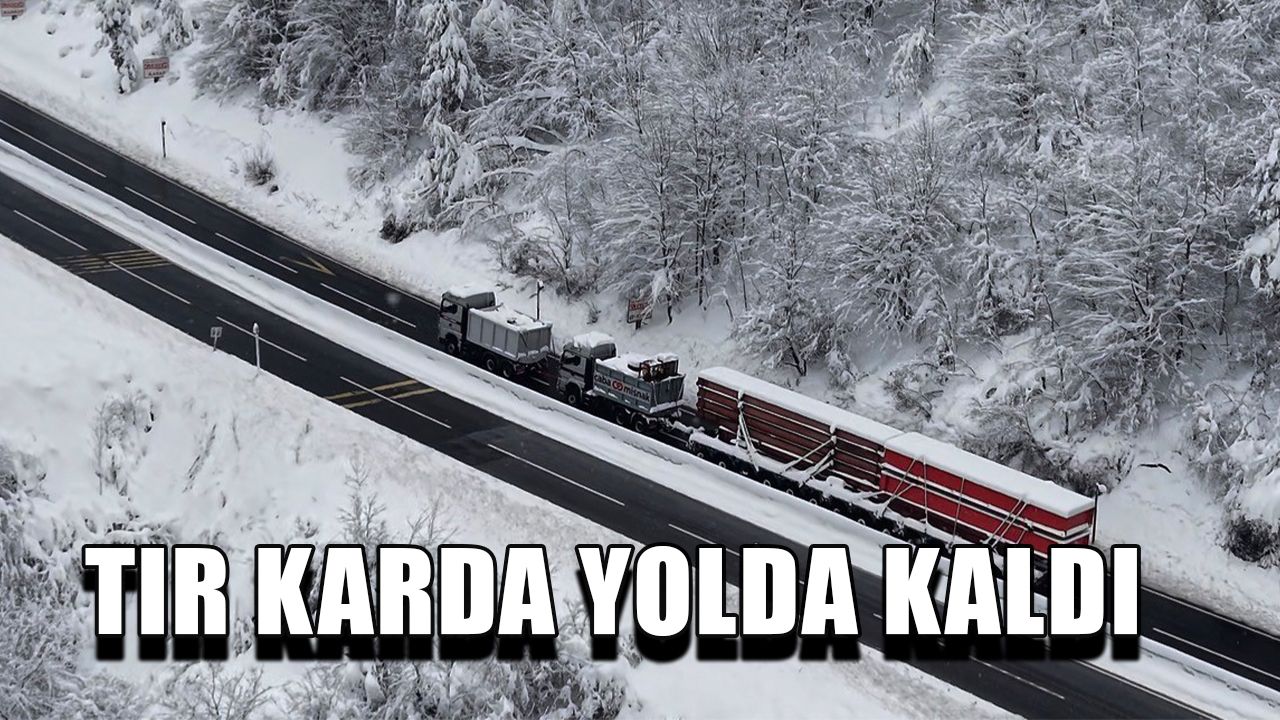 İstanbul'dan Hatay'a köprü ayağı getirmek için 2 gün önce yola çıkan tır, Bolu Dağı'nda etkili olan kar yağışında rampa çıkamayınca yolda kaldı. Kontrollü bir şekilde boş alana alınan tır için yolların açılmasının ardından kurtarma çalışması başlatıldı. Tek çekici ile kaldığı yerden çıkarılamayan köprü ayağı yüklü tır, 2 çekici ile birlikte bulunduğu yerden çıkarılarak Hatay'a gönderildi. O anlar ise havadan görüntülendi. (İHA)