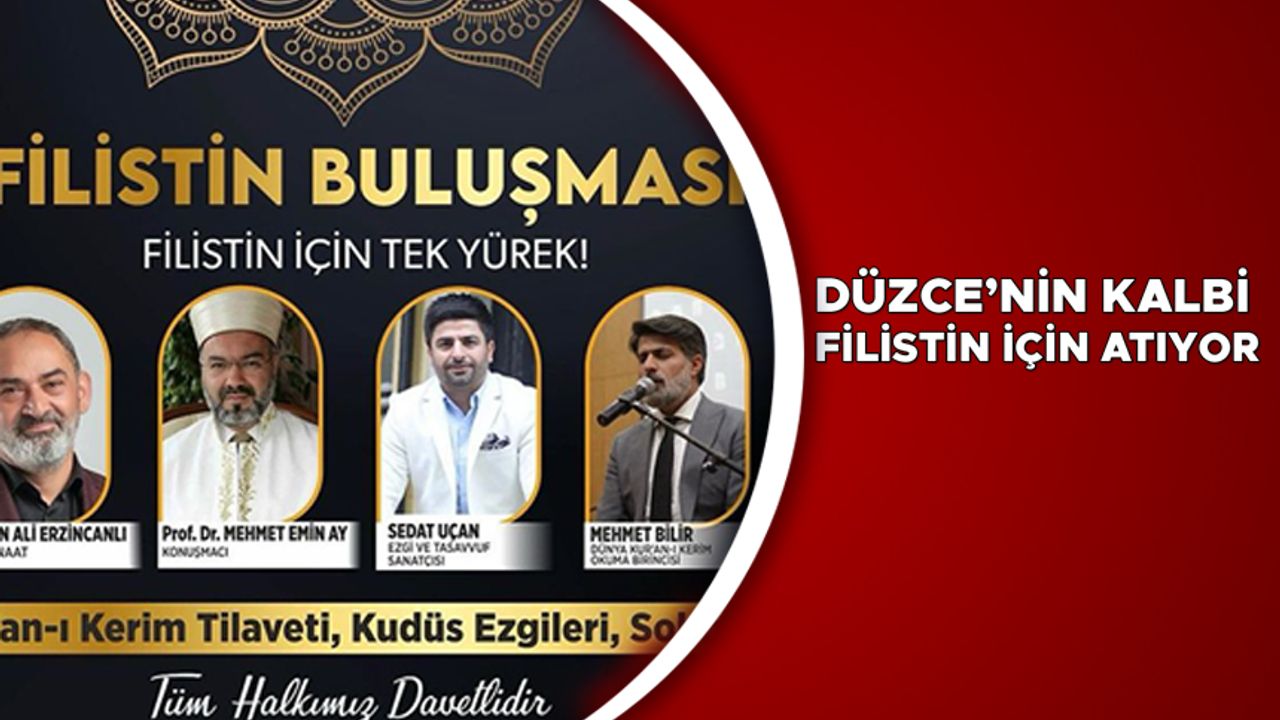 Düzenlenecek etkinliğe ilişkin Düzce Belediyesi’nden yapılan bilgilendirmede şunlar kaydedildi: “‘Filistin Buluşması’ başlığı altında Kur’an-ı Kerim Tilaveti, Kudüs ezgileri ve sohbetlerin gerçekleştirileceği programda Düzce, önemli isimlerin katılımıyla Filistin için tek yürek olacak.