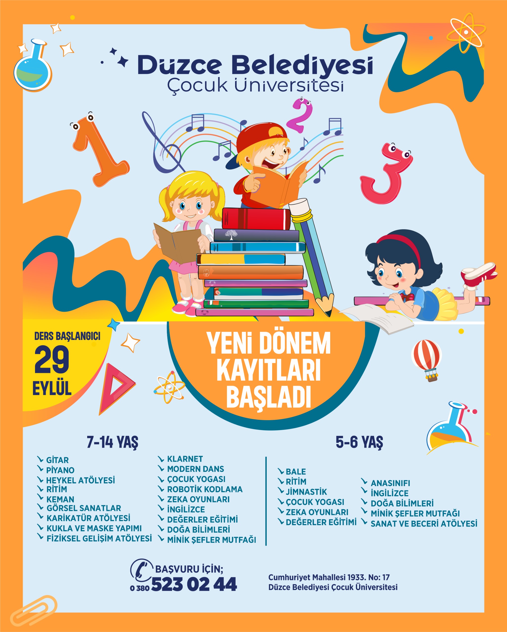 “Düzce Belediyesi Kültür İşleri Müdürlüğü bünyesinde hizmet veren Çocuk Üniversitesi yeni dönem kayıtlarını almaya başladı. 2025-2026 eğitim öğretim dönemi ilk yarısı için hazırlanan eğitim programı için ders zili 29 Eylül 2025 Pazartesi günü çalacak. Cumhuriyet Mahallesi 1933. Sokak No:17 adresinde faaliyetlerini sürdüren Çocuk Üniversitesi’nde 7-14 ve 5-6 yaş aralığındaki çocukların kabul edileceği, öğrencilerin ilgi ve becerilerine yönelik olarak 29 ayrı branş belirlendi.
