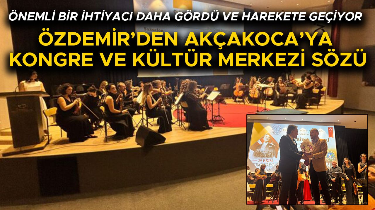 Konuşmasında, Akçakoca’ya yönelik önemli bir müjde de veren Özdemir, önümüzdeki süreçte ilçeye bin kişilik modern bir kongre ve kültür merkezi kazandıracaklarını açıkladı. Söz konusu tesisin; tiyatro, konser, şenlik ve çeşitli kültürel etkinliklere daha geniş imkân sunacağını belirten Özdemir, “Akçakoca’nın kültür ve sanat yaşamına değer katacağız. Bu yatırımı ilçemize kazandırmak için gerekli çalışmayı başlatıyoruz.” dedi.