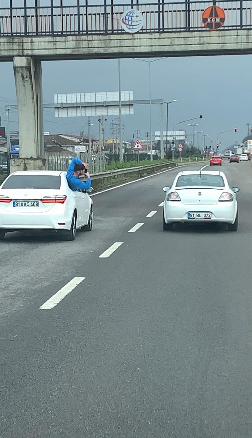 Aynı güzergahta ilerleyen başka sürücüler tarafından kayda alınan görüntülerde, otomobilin camından sarkan bir kişinin, diğer şeritten giden başka bir aracı video kaydına almaya çalıştığı görülüyor.