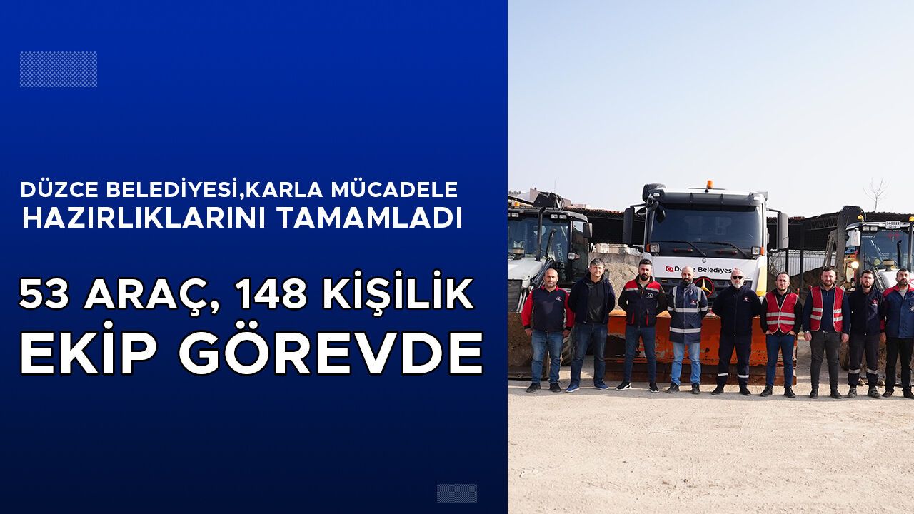 Düzce Belediyesi, karla mücadele çalışmaları için 7 adet kar bıçaklı tuzlama aracı, 15 küreme aracı, 3 greyder, 2 kar bıçaklı kamyon, 3 vidanjör, 3 kanal açma ve 20 pikap aracıyla birlikte toplam 53 araç ve 148 personel görevlendirdi. Karla mücadelede kullanılmak üzere 250 ton agrega ve 350 ton tuz depolandı.