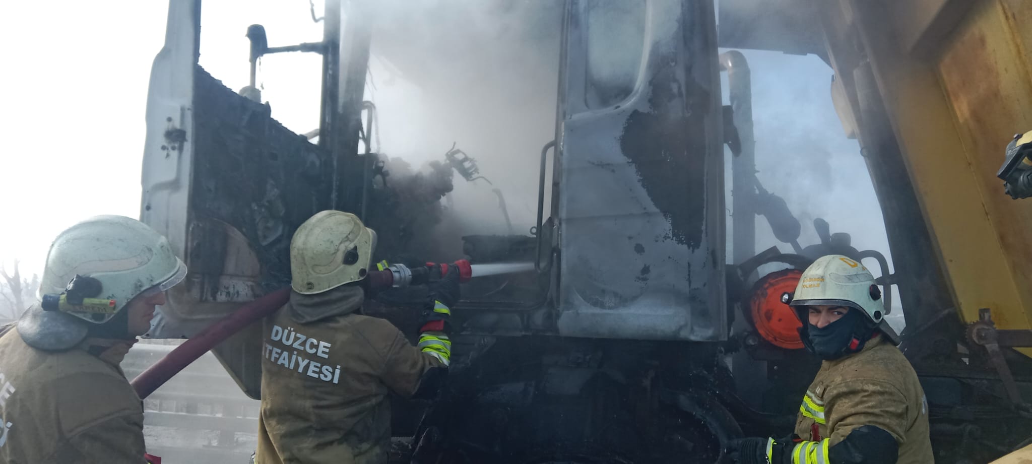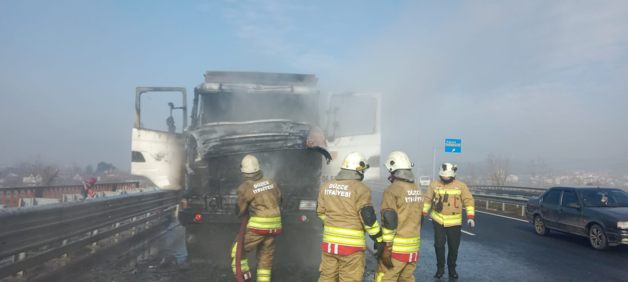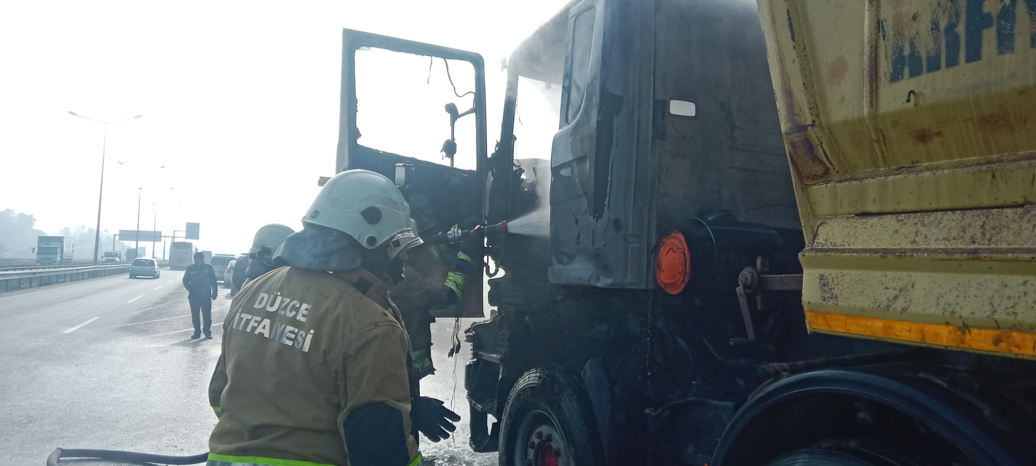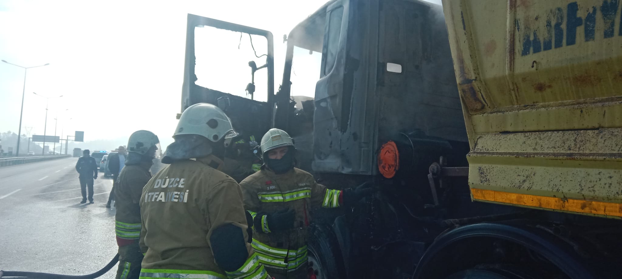 Düzce Belediyesi şirketi BELTAŞ’ın, D-655 Akçakoca Karayolu Çamköy Mahallesi mevkiindeki şantiyesini kiralayan firma olarak bilinen Ege Asfalt’a ait kamyondan Kuzey Çevre Yolu’nda seyir halindeyken dumanlar yükseldi. Motor kısmından aniden alev alan aracı emniyet şeridine çeken şoför, yangın tüpleri ile müdahale etmeye çalıştı. Hızla aracı saran yangını söndürmekte yetersiz kalan şoför 112 Acil Çağrı Merkezi’nden yardım istedi. İhbar üzerine bölgeye itfaiye ve polis ekipleri sevk edildi.