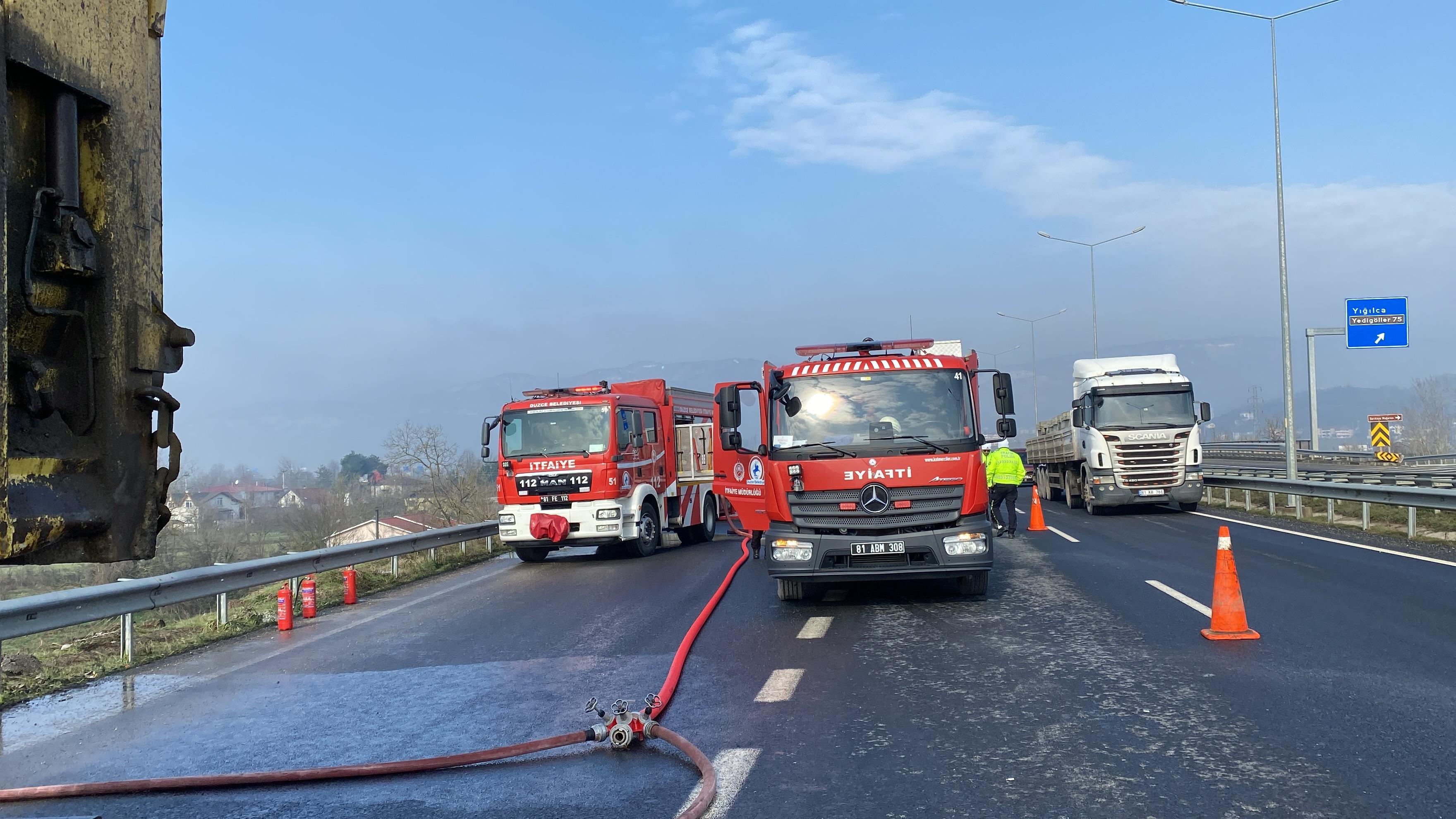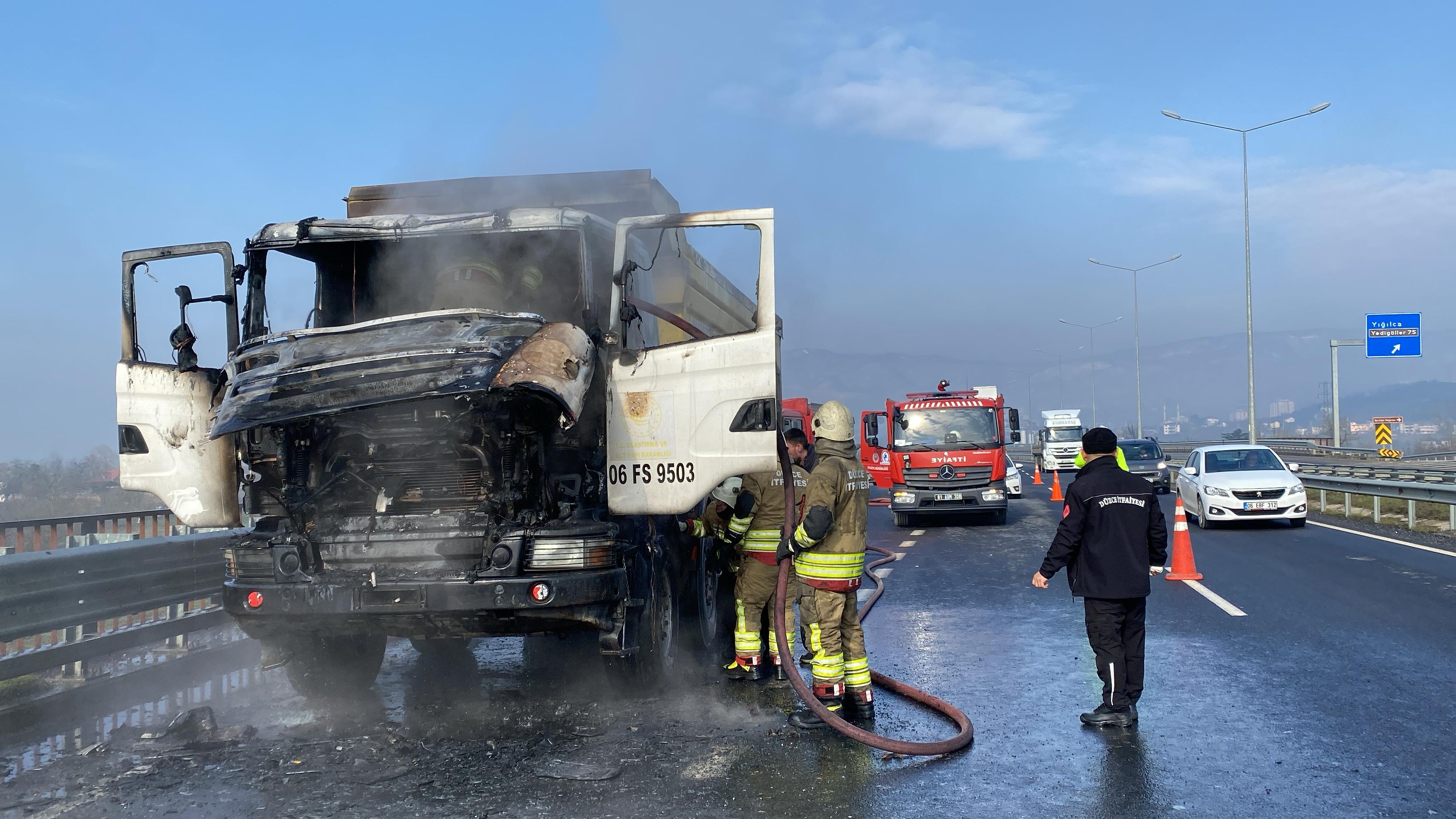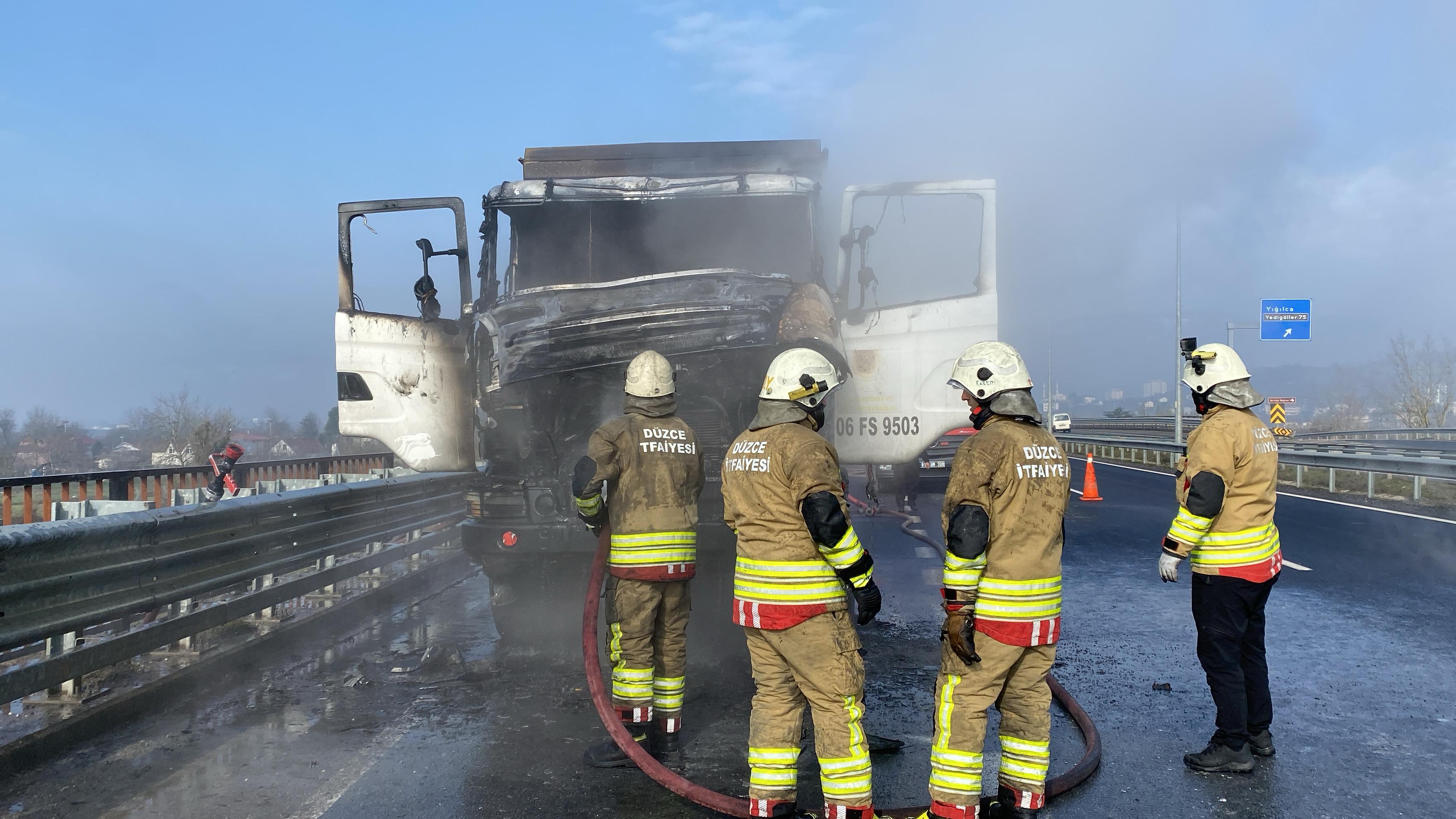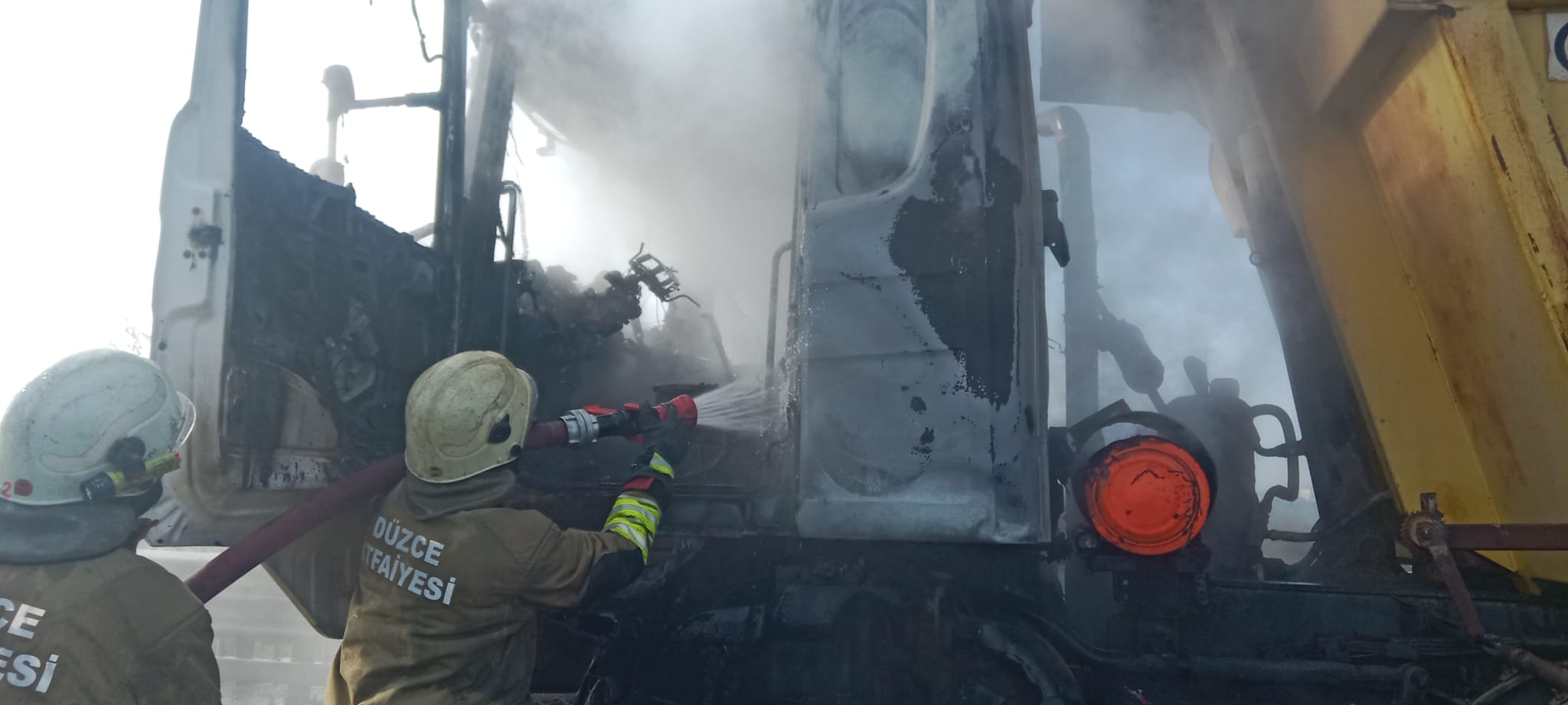 Düzce Belediyesi şirketi BELTAŞ’ın, D-655 Akçakoca Karayolu Çamköy Mahallesi mevkiindeki şantiyesini kiralayan firma olarak bilinen Ege Asfalt’a ait kamyondan Kuzey Çevre Yolu’nda seyir halindeyken dumanlar yükseldi. Motor kısmından aniden alev alan aracı emniyet şeridine çeken şoför, yangın tüpleri ile müdahale etmeye çalıştı. Hızla aracı saran yangını söndürmekte yetersiz kalan şoför 112 Acil Çağrı Merkezi’nden yardım istedi. İhbar üzerine bölgeye itfaiye ve polis ekipleri sevk edildi.