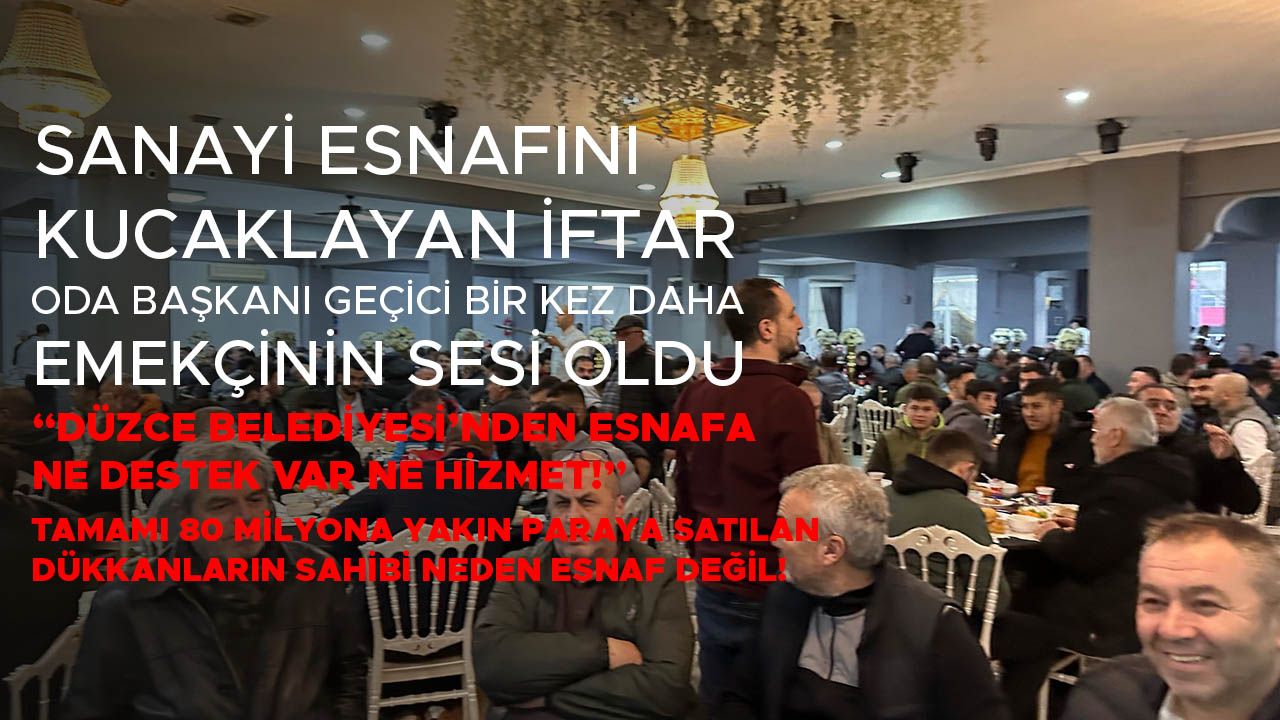 Demir ve Madeni Sanatkarlar Odası’nın düzenlediği geleneksel iftar programında konuşan Oda Başkanı Murat Geçici bir kez daha sitem dolu sözlerle Düzce Belediyesi’nin neden emekçi esnafın sıkıntılarına merhem olup işlerini kolaylaştırmadığını sorguladı. Uzun yıllardır Eski Sanayi Çarşısı’nda kepenk açan ve Kentsel Dönüşüm Projesi kapsamında belediye şirketi BELTAŞ’ın inşa ettiği sanayi alanına taşınmaları istenen sanayi esnafının, hem keyfi ruhsat uygulamaları hem de yeni dükkanlar için BELTAŞ yönetiminin istediği fahiş fiyatlar yüzünden büyük sancı yaşadığını belirten Geçici, ayrıca belediyenin son bir yıl içerisinde tamamını satarak 70 – 80 milyon gelir elde ettiği Küçük Sanayi Sitesi’ndeki 18 dükkanın neden esnaf olmayan kişilere verildiğini irdeledi. Belediyenin konu para kazanmak olunca şirketler üzerinden her türlü tasarrufu kullandığına işaret eden Geçici, ‘KSS’deki dükkanları bizzat yapıp satan belediye, yıllardır gelmeyen yol ve altyapı hizmetini esnafa yüklemeye kalkıyor.’ serzenişinde bulundu.