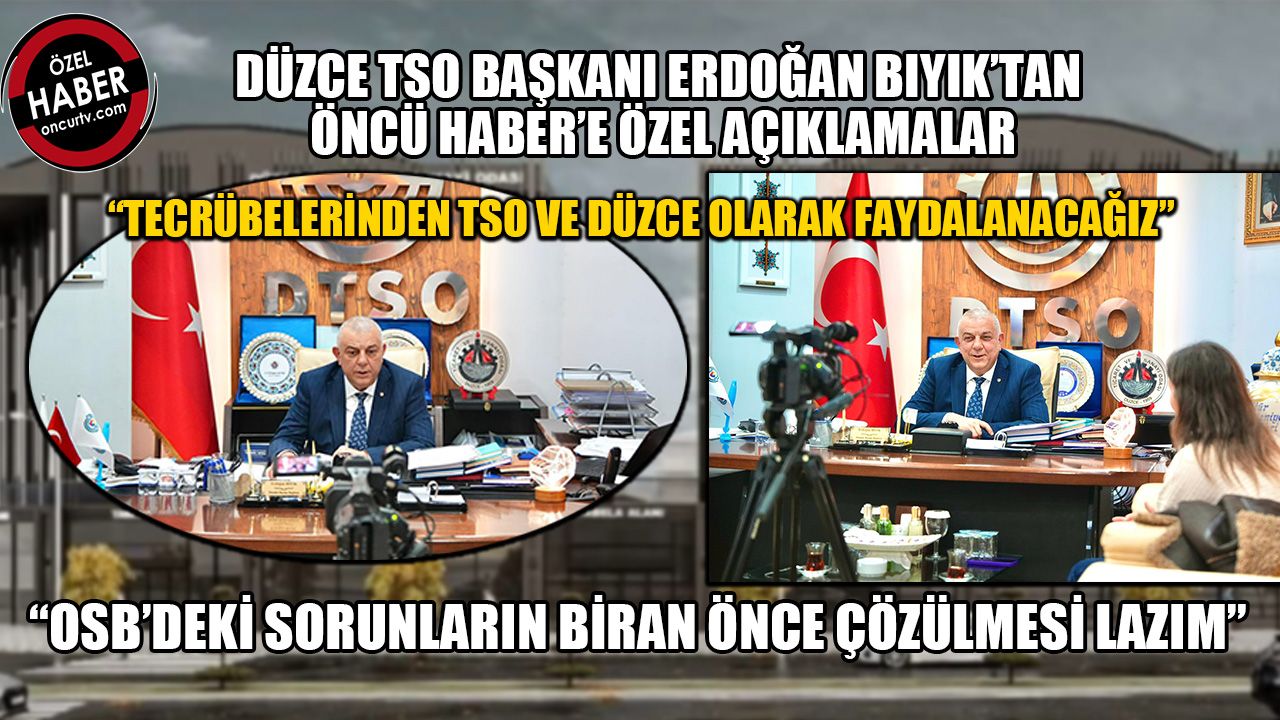Öncü Haber ekibinin başlattığı Düzce Valisi Mehmet Makas’tan beklentilerin, Düzce’nin farklı kesimlerine ve dinamiklerine sorulduğu röportaj serisi yankı bulmaya devam ediyor. Bu kapsamda serinin dokuzuncu röportajını gerçekleştirmek üzere, Düzce Ticaret ve Sanayi Odası Başkanı Erdoğan Bıyık’ın kapısını çalan Öncü Haber’den Zeki Aşıkoğlu ve Tuğba Aksoy, Bıyık’ın görüşlerini aldı. Yaptığı açıklamada Bıyık, Düzce’nin birlik ve beraberlik içinde çalıştığını belirtti. Bıyık, Gümüşova Organize Sanayisi’nin eksikliklerinin giderilmesi için harekete geçilmesi gerektiğini kaydetti. Bıyık, cari açığın kapatılması adına sanayilerin üretimlerinin artırılmasının önemine dikkat çekerek, “Biz de üretim yapan istihdam sağlayan organizelerdeki sanayilerimizin daha verimli bir ortamda üretim yapıp ihracat yapıp cari açığımızın kapanmasına destek olmasını bekliyoruz. Bunlar için de ihracatçımızın fabrikalarımızın üretimlerinde olan tüm aksaklıkları gidermemiz gerekiyor. Bunu da Sayın Valimizin Başkanlığında Sayın Bakanımız Dr. Faruk Özlü’yle vekillerimizle bunu sağlayacağımıza inanıyoruz.” dedi.