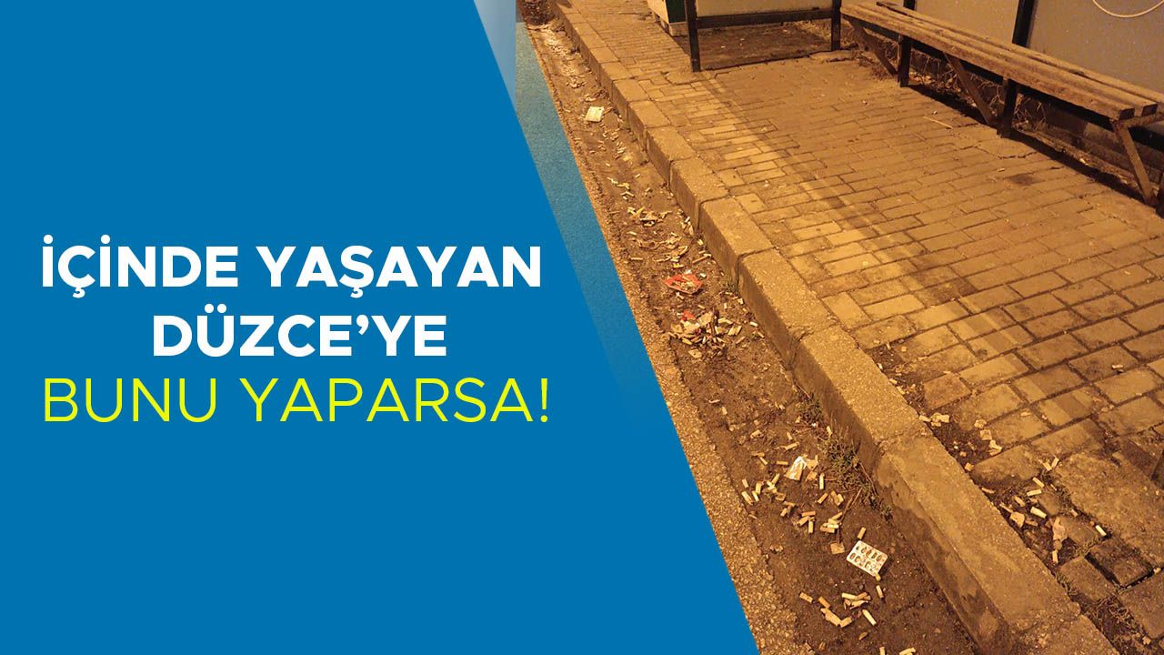 Bir diğer üzücü manzaranın adresi ise merkeze bağlı Çavuşlar Mahallesi oldu. Çavuşlar TOKİ Cami önünde bulunan otobüs durağının kirliliğin pençesindeki hali ‘Biz nasıl gelişmiş bir kent olacağız?’ sorusunu bir kez daha sorgulamaya açtı. Bir yandan Düzce’nin çevresindeki büyük kentlerle yarışması istenirken diğer yandan içerisindeki güzelliklere yaşayanlar tarafından gölge düşürülmesi şehrin imajını zedeleyen devasa bir sorun olarak ortada duruyor. Durak çevresinin içler acısı halini fotoğraflayan duyarlı vatandaş, bu durumu eleştirmeden edemedi ve “Durak maalesef pislik yuvası. Bizim tertemiz yurdum insanımızın midesizliği!” dedi.