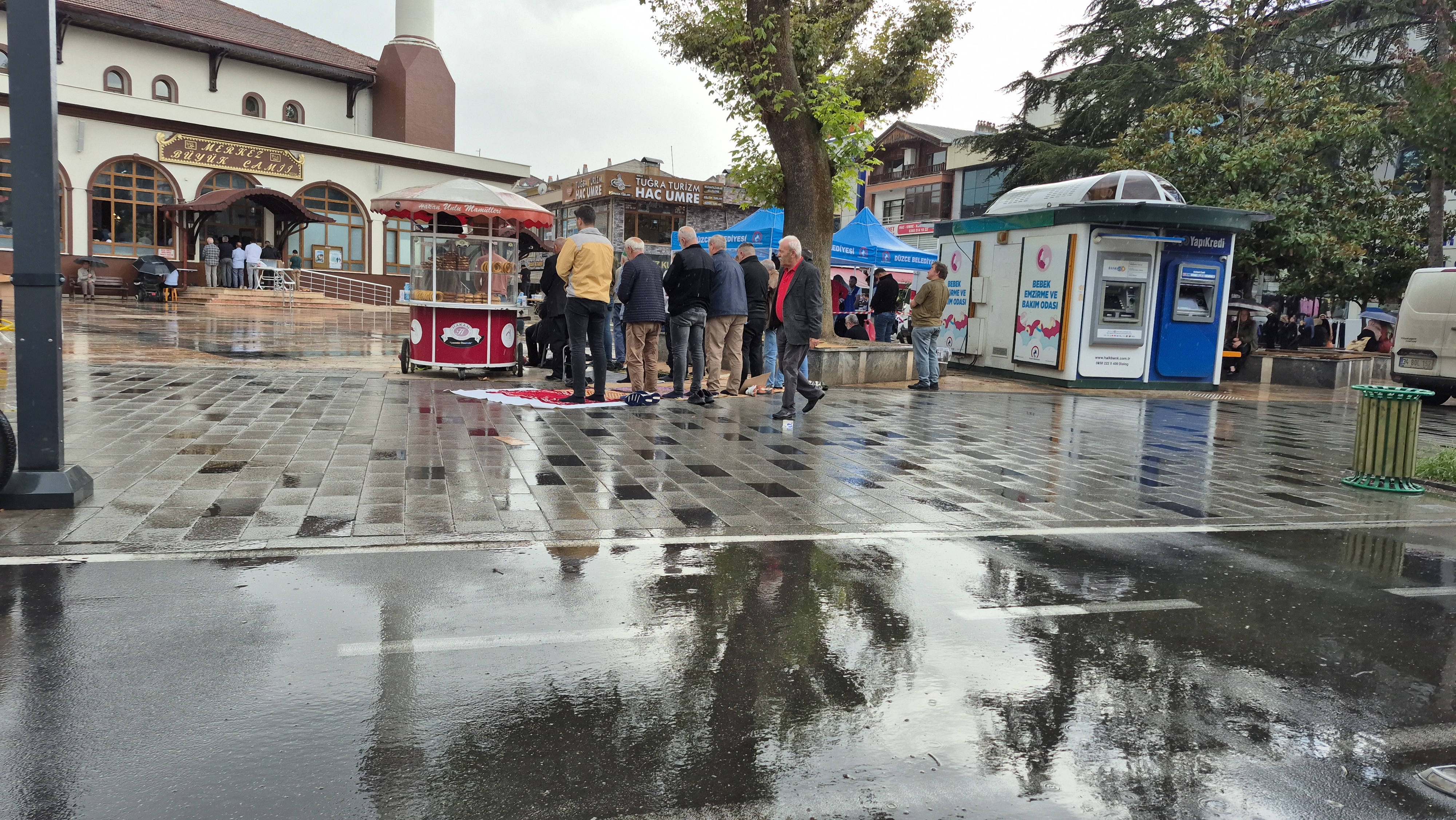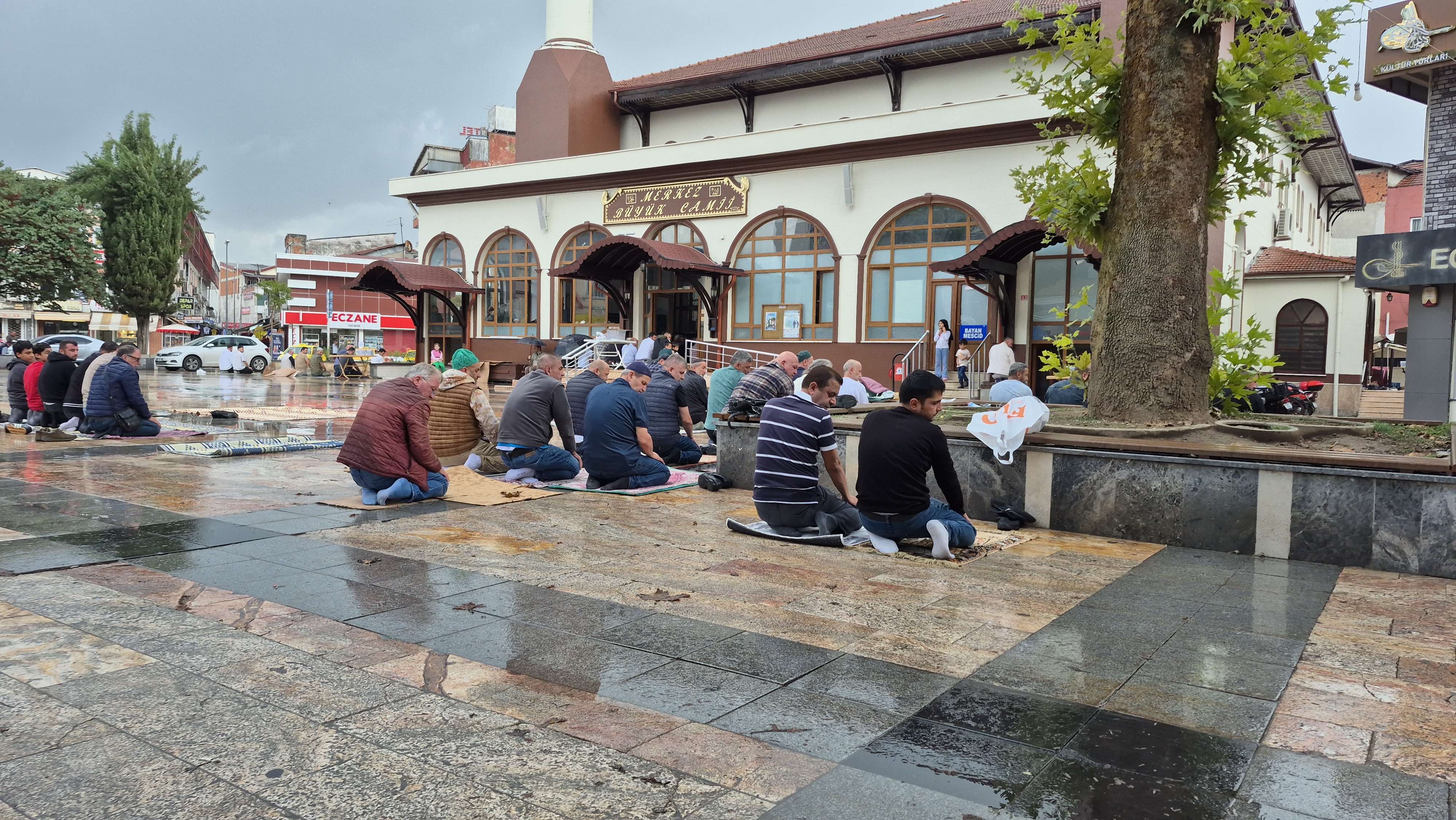 Camilerin içi kısa sürede dolunca, namaza geç kalan cemaat cami avlularında ve dışında yerlerini aldı. Yağmura rağmen seccadelerini seren cemaat, ibadetlerini yağış altında yerine getirdi.