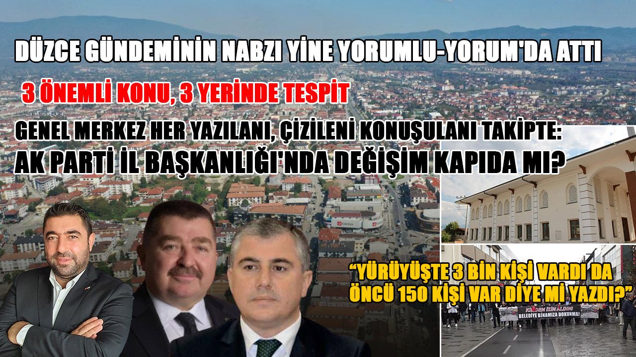 Öncü Medya Genel Yayın Yönetmeni Sadullah Ünsal, AK Parti İl Başkanlığı'nda değişim rüzgarları esmesinin kuvvetli muhtemel olduğunu belirterek, koltuk için adı geçen 3 ismi ilk kez açıkladı. Partinin emektar ismi Hakan Kuşçuoğlu, Kızılay Şube Başkanı Av. Halil Aydın ile Düzce Belediye Meclisi Başkanvekili Av. Arb. Ali Dilber’in isminin geçtiğini dile getiren Ünsal, “Bu üçlünün üzerinde bir değerlendirmelerin olduğu söyleniyor. Peki, mevcut il başkanı yok mu? Neden bunu söylüyorlar? Demek ki; bir il başkanları üzerinde tasarruf da Düzce’ye dokunuldu. Bu üç isim de gündemde. Biri il başkanı olabilir diye bir söylenti var.” diye konuştu. CHP’nin geçtiğimiz Cumartesi günü, Cedidiye Meydan Projesi 2. Etap çalışmaları kapsamında belediye binasının yıkılmasına tepki göstermek amacıyla yaptığı yürüyüşe de değinen Ünsal, “Orada bin 500, 3 bin veya 15 bin kişi vardı da biz 150 kişi var diye mi yazdık? Yok. Arkadaşlarımız tespit etmişler, bunu da herkes ve Düzce kamuoyu gördü. Burada eksik olan şu: Yani Cumhuriyet Halk Partisi geleneğinde eleştirilere açık olmak var. Yapılan herhangi bir eğri işin veya olumsuz bir durum iç mekanizmalarda eleştiriye açık bir kişiliğini biliyoruz." dedi. CHP Milletvekili Talih Özcan'ın yürüyüşte yer almamasını da es geçmeyen Ünsal, Çilimli'den buruna hoş gelmeyen kokuları da bir kez daha gündeme taşıdı.