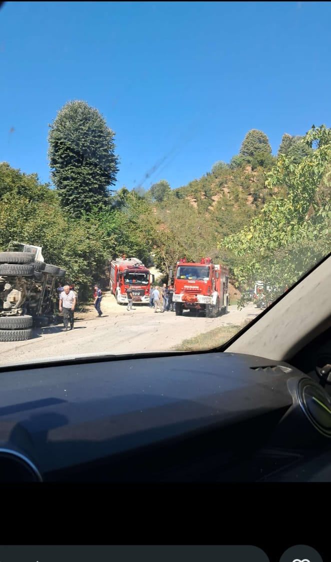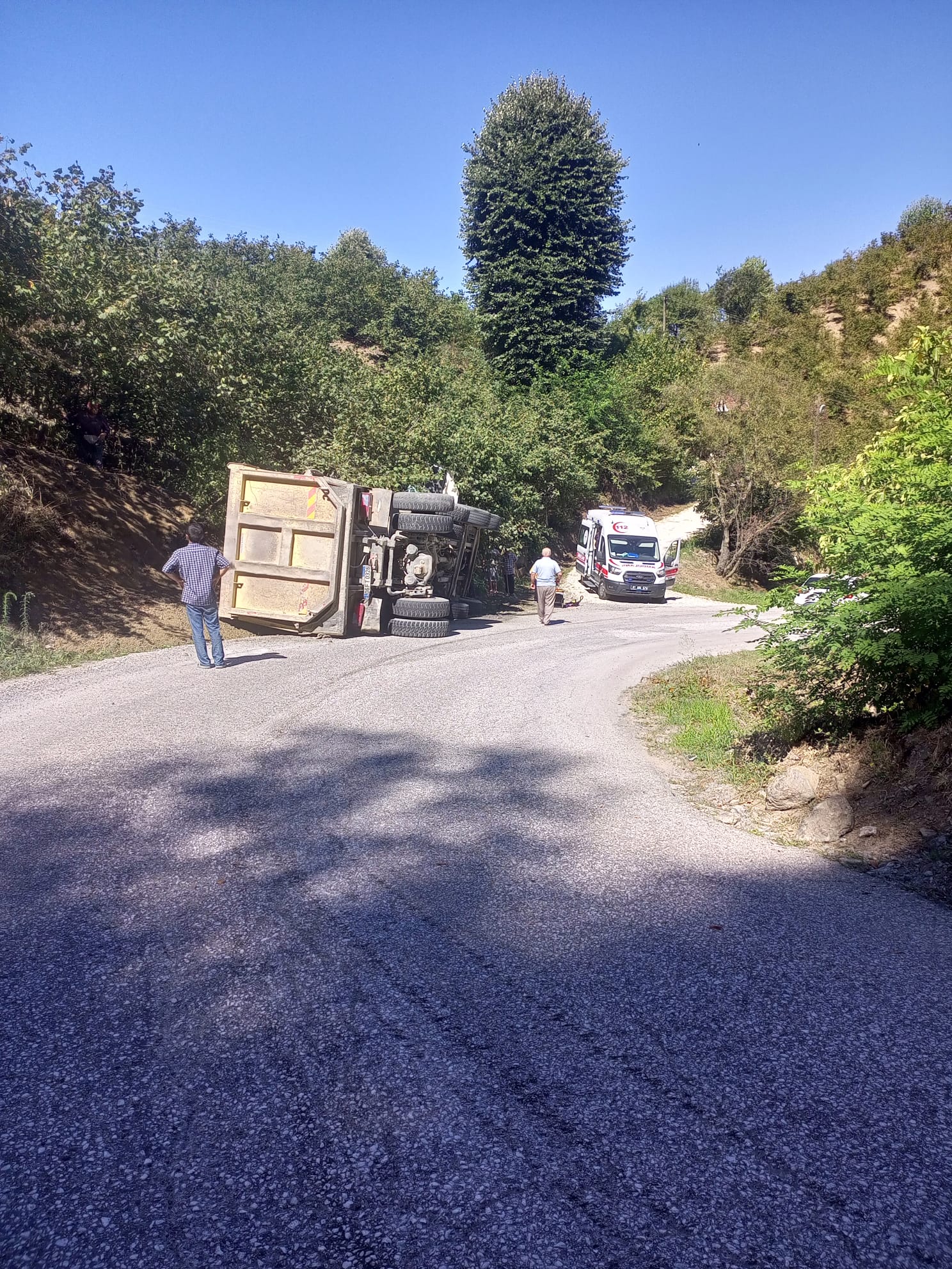 Düzce’de merkeze bağlı Çınardüzü köyü yolunda köylülerin haftalardır tehlike saçtığı gerekçesiyle eylem yaptığı yolda kontrolden çıkan 06FT0326 plakalı kamyon şarampole devrildi.