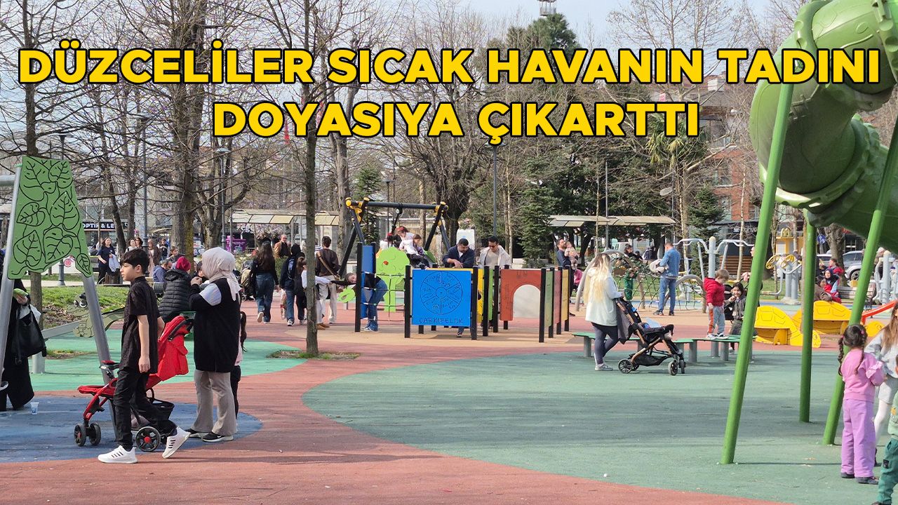 Düzce’de ramazan ayının ilk hafta sonu güneşli ve sıcak güne denk geldi. Mevsim normalleri üzerinde seyreden hava sıcaklıklarında Düzceliler çocuklarını alıp parklara bahçelere akın etti. Bazı anne ve babalar çocuklarıyla birlikte oyun parkında oyuncaklarda oynamayı tercih ederken, bazıları da oyun parklarındaki banklarda oturarak eğlenen çocuklarını izlemeyi tercih etti.