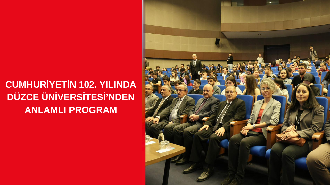 Programın açılış konuşmasını gerçekleştiren Düzce Üniversitesi Rektörü Prof. Dr. Nedim Sözbir, cumhuriyetin sadece bir yönetim biçimi değil; bir milletin yeniden ayağa kalkışının, birlik ve azim içinde toparlanışının adı olduğunu belirterek “102 yıl önce bu topraklarda bir umut yeşerdi. Yorgun ama kararlı bir millet, ‘Egemenlik kayıtsız şartsız milletindir’ diyerek geleceğine yön verdi.” şeklinde konuştu.