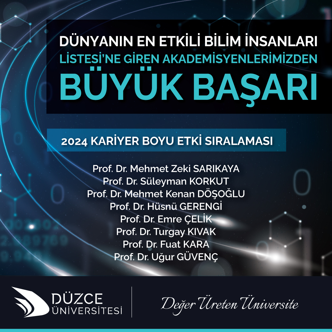 “2024 yılı baz alınarak hazırlanan Dünyanın En Etkili Bilim İnsanları Listesi 2024 Etki Listesi’nde; Düzce Üniversitesi Fen Edebiyat Fakültesi Öğretim Üyesi Prof. Dr. Mehmet Zeki Sarıkaya Genel Matematik alanında 91, Eğitim Fakültesi Öğretim Elemanı Arş. Gör. Dr. Kağan Kırcaburun Madde Bağımlılığı alanında 193, Mühendislik Fakültesi Öğretim Üyesi Prof. Dr. Emre Çelik Enerji alanında 436. sırada yer alırken, Gümüşova Meslek Yüksekokulu Müdürü Doç. Dr. Şenol Şirin Makine Mühendisliği ve Ulaştırma alanında 571, Mühendislik Fakültesi öğretim üyelerinden Prof. Dr. Turgay Kıvak Malzemeler alanında 1211, Polimerler alanında Prof. Dr. Hüsnü Gerengi ise 1466. olma başarısı gösterdi.