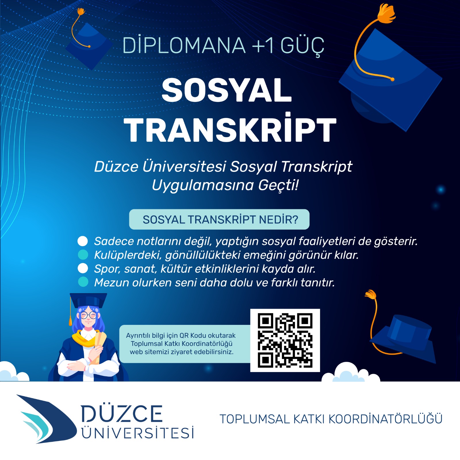 Düzce Üniversitesi Toplumsal Katkı Koordinatörlüğü tarafından öğrencilerin yalnızca akademik başarılarını değil, aynı zamanda sosyal, kültürel ve gönüllülük temelli katkılarını da görünür kılmak amacıyla Sosyal Transkript (not dökümü) Uygulaması’nın başlatıldığı bildirildi. Sosyal Transkript Uygulaması ile öğrencilerin toplumsal katkı, sosyal sorumluluk ve kişisel gelişim alanlarındaki faaliyetleri, resmi ve doğrulanabilir bir belgeyle kayıt altına alınarak mezuniyet sürecinde akademik transkripte ek olarak sunulacak.