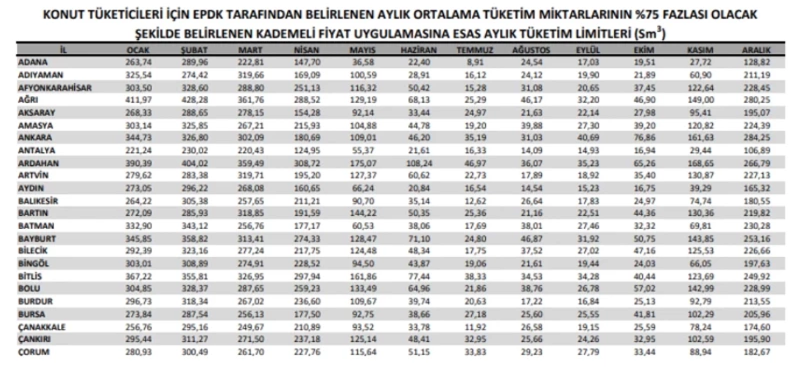 Enerji Piyasası Düzenleme Kurumu (EPDK) tarafından yapılan düzenleme kapsamında, Türkiye genelinde her il için ayrı ayrı aylık ortalama doğal gaz tüketim miktarları belirlendi. Yeni sistemle birlikte konut abonelerinin tüketimleri bu ortalamalara göre değerlendirilecek.