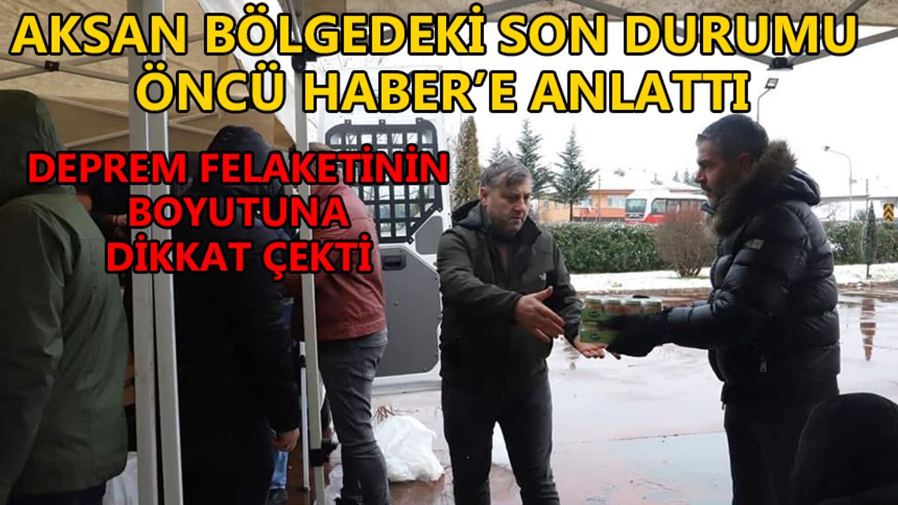 Aksan, "Son durumda Kahramanmaraş Elbistan'ın üçte ikisi yok olmuş durumda ve kalan binalar da oturulacak durumda değil. Halkımız gerçekten çok duyarlı. Tırlar dolusu yardım malzemesi geliyor. 10 günlük - 15 günlük ihtiyacımız görülür. Depolar dolu. Henüz hiç dokunulmamış yıkıntılar var. Köylerde de yıkım var. Burası haritadan silinmiş durumda. İlk önceliğimiz, enkaz altındaki insanları çıkarmak. Hava şartları -10 dereceyi gösteriyor. Hava durumu çok kötü… Buradaki en büyük sorun, enkaz altındaki insanların çıkarılmamış olmaması. Yollar, yardım tırlarından kilitlenmiş durumda. Yardımların yavaşlaması gerek. Çünkü depo yok, yığılma var. Yetkililerden bilgi alınarak yardım gönderimi sağlanmalı. İhtiyaç fazlası ürün yığını var" diye konuştu.