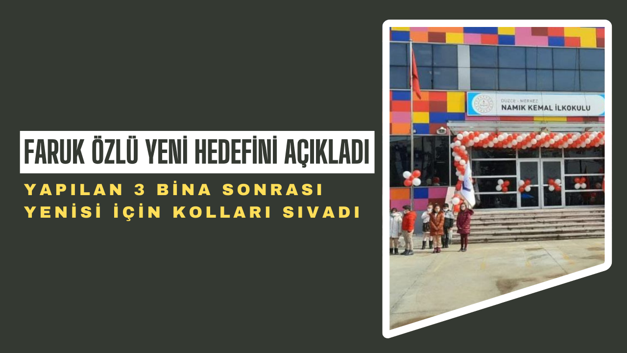 Şehir merkezinde bulunan okulların şehir dışına taşınması konusunda önemli mesafeler kat edildi. Eğitim noktasında ciddi gayret sarf ederek, Düzce’de ikili eğitimin sona erdirilmesi noktasında büyük adımlar atan Düzce Belediye Başkanı Dr. Faruk Özlü, Karacahacımusa Mahallesi’ndeki Esin Olcay Anadolu Lisesi, Aziziye Mahallesi’nde hizmete giren Kasım Aktaş Ortaokulu ve Darıcı Mahallesi’ndeki İsmetpaşa Ortaokulu’ndan sonra kent merkezinde kalan Namık Kemal İlkokulu için de düğmeye basılmasını istedi.