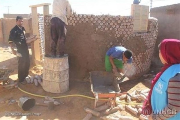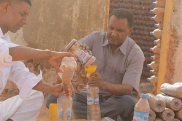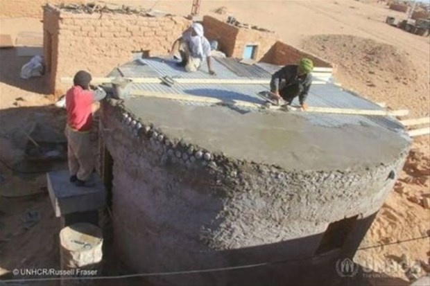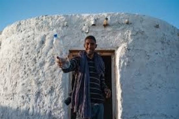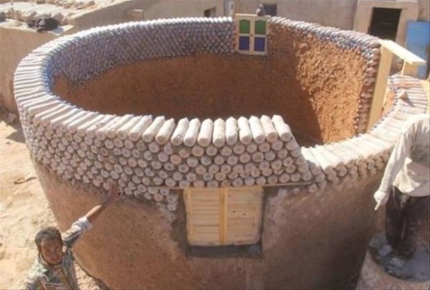 Cezayir’de Tateh Lehbib Breica (27), kumla doldurduğu pet şişelerden ev yapıyor.