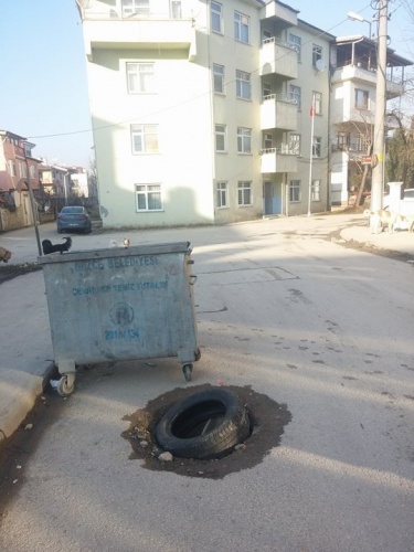 Nusrettin mahallesi 4 nolu sağlık ocağı önünde çöken kapağın tedbiri mahalleli tarafından araba lastiği ve çöp tenekesi ile alındı .