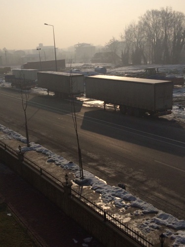 Ruhi Kurnaz caddesinde tek şeridi ve otobüs durağını işgal eden dorseler.