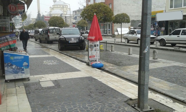 Kaldırıma koyulan reklam tabelaları ve park edilen araçlar yaya yolunu kullanımını zorlaştırıyor