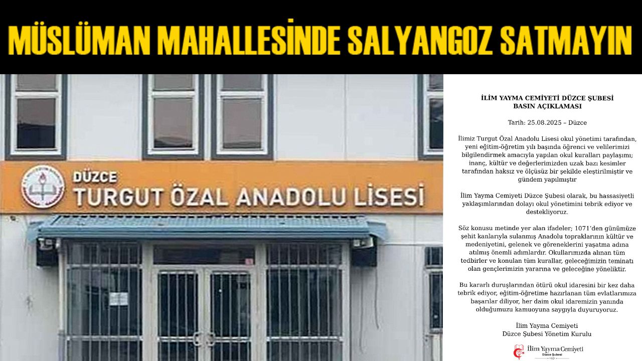 “İlimiz Turgut Özal Anadolu Lisesi okul yönetimi tarafından, yeni eğitim-öğretim yılı başında öğrenci ve velilerimizi bilgilendirmek amacıyla yapılan okul kuralları paylaşımı; inanç, kültür ve değerlerimizden uzak bazı kesimler tarafından haksız ve ölçüsüz bir şekilde eleştirilmiştir ve gündem yapılmıştır. İlim Yayma Cemiyeti Düzce Şubesi olarak, bu hassasiyetli yaklaşımlarından dolayı okul yönetimini tebrik ediyor ve destekliyoruz. Söz konusu metinde yer alan ifadeler; 1071’den günümüze şehit kanlarıyla sulanmış Anadolu topraklarının kültür ve medeniyetini, gelenek ve göreneklerini yaşatma adına atılmış önemli adımlardır. Okullarımızda alınan tüm tedbirler ve konulan tüm kurallar, geleceğimizin teminatı olan gençlerimizin yararına ve geleceğine yöneliktir. Bu kararlı duruşlarından ötürü okul idaresini bir kez daha tebrik ediyor, eğitim-öğretime hazırlanan tüm evlatlarımıza başarılar diliyor, her daim okul idaremizin yanında olduğumuzu kamuoyuna saygıyla duyuruyoruz.”