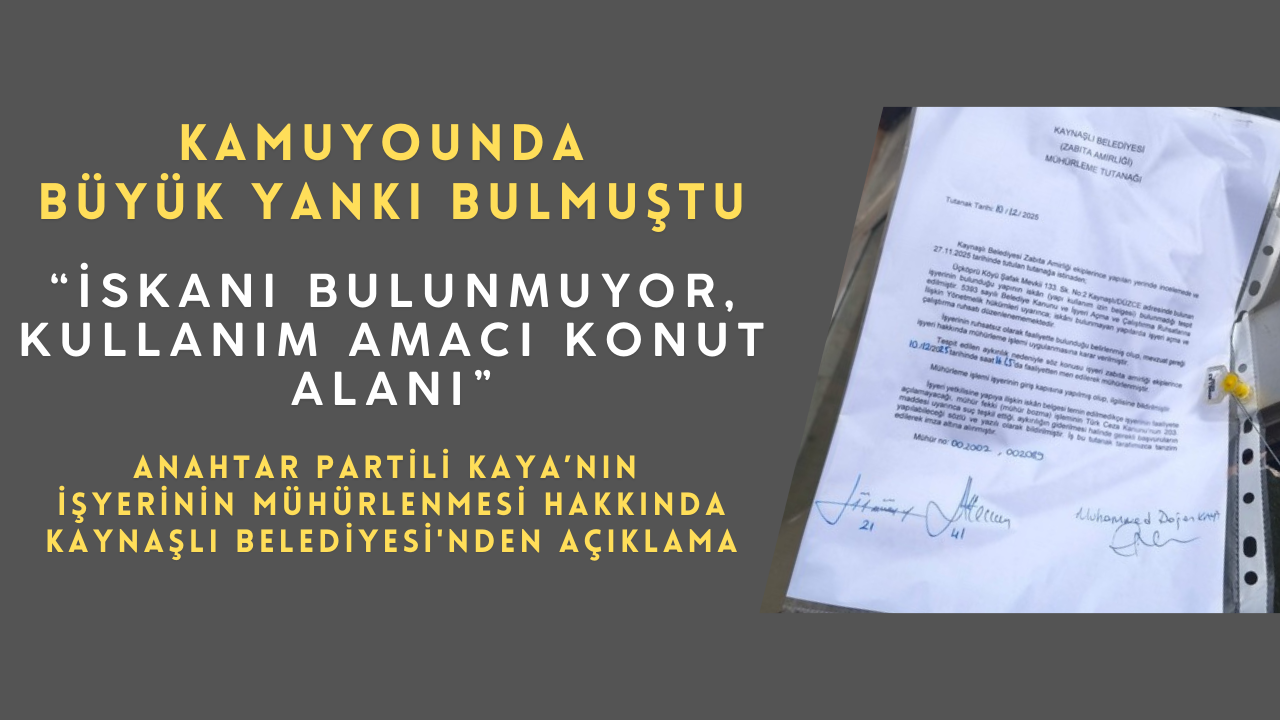 Kaynaşlı Belediyesi tarafından mühürlenen, Anahtar Partisi Merkez İlçe Başkanı Muhammed Doğan Kaya’nın işyeri ile ilgili, beklenen açıklama geldi. Kaynaşlı Belediyesi tarafından yapılan açıklamada, işyerinin iskanının bulunmaması ve iş yerinin yapı kayıt belgesine göre kullanım amacının ise konut alanı olduğu için mühürlendiği belirtildi.