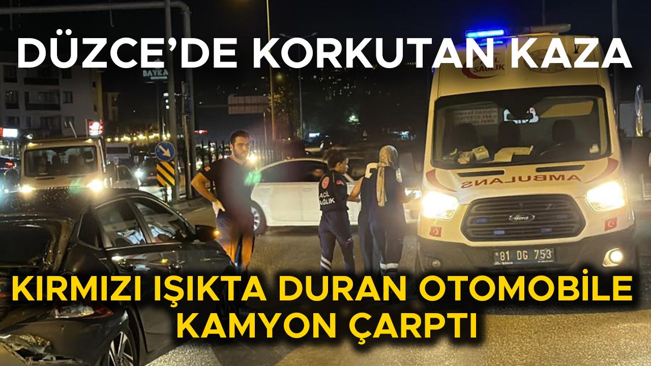 Bu esnada aynı güzergahta seyir halinde olan Tahir K. idaresindeki 81 ABY 660 plakalı kamyon, kırmızı ışıkta bekleyen otomobile çarptı.