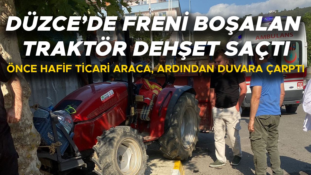 Sürücüsünün direksiyon hakimiyetini kaybettiği traktör önce 81 ACP 396 plakalı hafif ticari araca, ardından ise, yol kenarındaki fabrikanın duvarına çarptı.