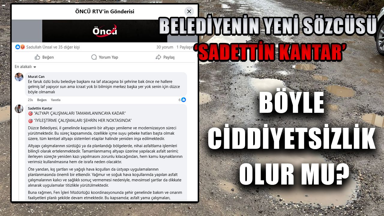 Düzce Belediye Başkanı Dr. Faruk Özlü’nün sosyal medya savunucusu ‘Sadettin Kantar’ rumuzlu hesap, sanki belediyenin Fen İşleri Müdürlüğü yetkilisi gibi haberin altına şu bilgilendirme mesajını paylaştı: