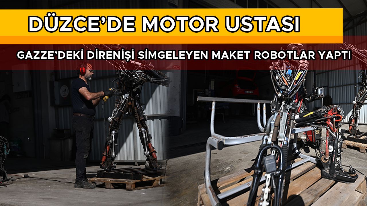 Düzce Küçük Sanayi Sitesi'nde bulunan motor tamirhanesinde kullanım ömürlerini tamamlamış atık malzemelerden hayal ürünü küçük objeler ve maket robotlar yapan 53 yaşındaki motor ustası Çetin, Filistin halkının direnişini sanatına yansıtmak istedi.