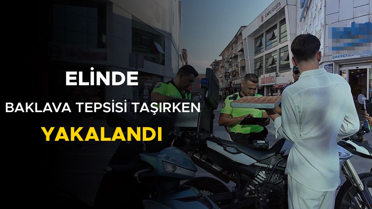 Diğer yandan, caddede tehlikenin boyutunu gösteren bir görüntü ortaya çıktı. Hem kask takmayan hem de motosiklet kullanırken bir elinde baklava tepsisi taşıyan sürücüsü cezaya itiraz edemedi. Baklava tepsisini bırakan sürücüye de 993 lira cezai işlem uygulandı
