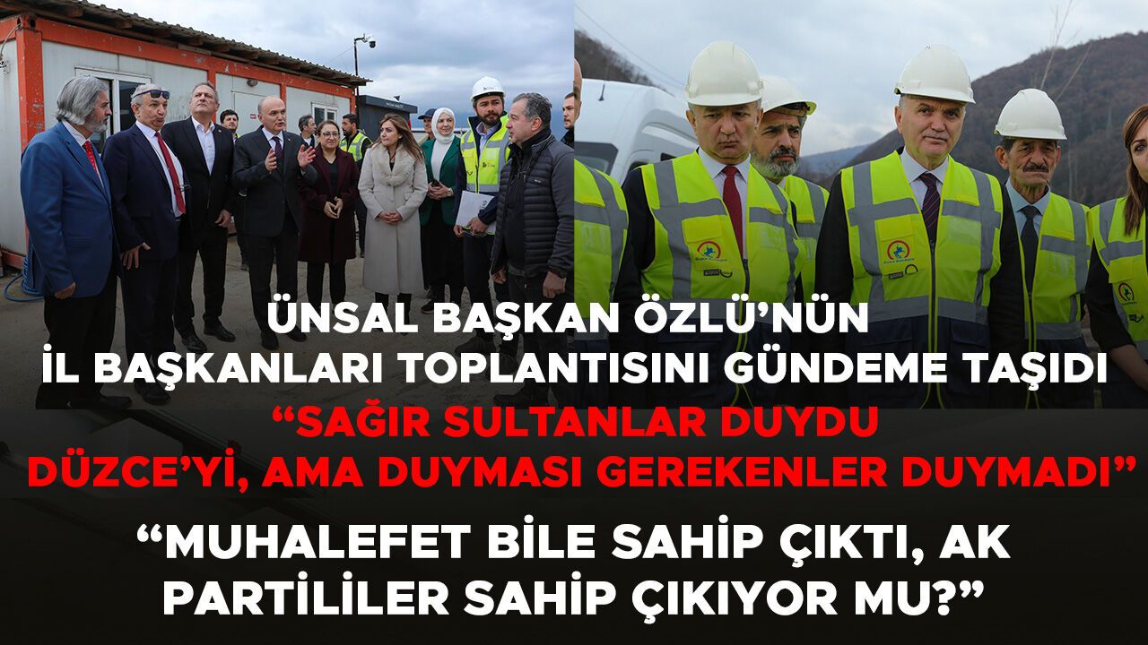 “Sağır sultanlar duydu Düzce'yi ama duyması gereken sultanlar duymadı” diyen Ünsal, “Maalesef ama duyması gerekenler, bilmesi gerekenler bir şeyi bildi. Geçtiğimiz hafta, belediye başkanı Dr. Faruk Özlü tüm Düzce'deki partilerin il başkanlarını, grubu olanların, olmayanların hepsini bir davet etti. Sabah 10:00’da başladı. Akşam 19:30'a kadar devam etti. Bizim arkadaşlarımız il başkanlarıyla röportaj yaptılar, bunun değerlendirilmesi noktasında. Fakat bu basında veya Düzce kamuoyunda çok bir yer edinmedi gibi geldi bana. Şimdi düşünün bütün iktidar elinizde, yetkiler elinizde, güç elinizde. Genel iktidarda da yerel iktidarda da muktedirsiniz, iktidarsınız. Belediye başkanısınız. Yani belediye başkanları bize ne derlerdi eskiden? Yani gene de öyledir. Adam asmaz, para basmaz. Bu kadar yetkilisiniz ve partilileriniz içinde, parti yönetiminizde, siyasette sizin yaptıklarınızı övenler de var, eleştirenler de var. Bu gayet yani siyasetin gereği. Ancak övgünün ve takdirin karşı taraftan gelmesi fevkaladenin fevkinde” ifadelerini kullandı.