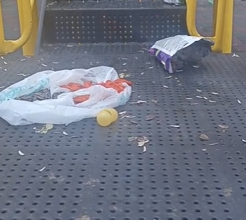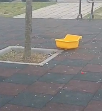“Burası Karaca Mahallesi’ndeki oyun parkı. Gördüğünüz gibi her yer çöp ve kırıklarla dolu. Bunlar insanlığa sığmayan görüntüler. Çocuklarımız burada oynuyor. Burayı bu kadar pis bırakmanın bir anlamı var mı? Şuraya bakar mısınız?”