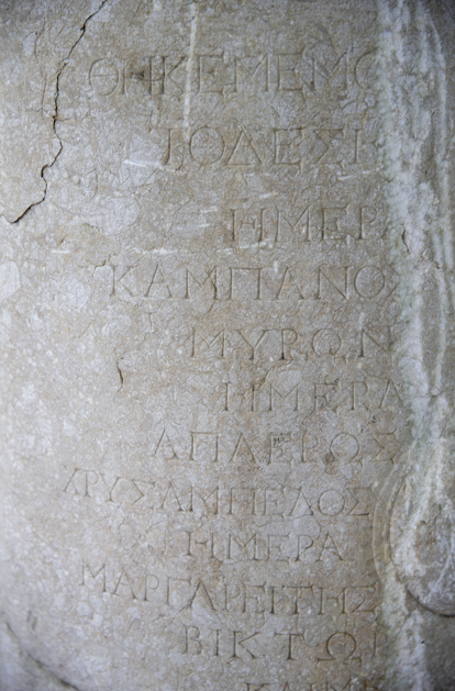 Roma toplumunda ilgiyle takip edilen gladyatör oyunlarına ilişkin Grekçe yazılan anıtta şu bilgiler yer alıyor: "İlk gün: Kılıç-kalkan gladyatörü Campanus 65 zafer, savaş arabasıyla dövüşen Myron ise 43 zafer elde etmiştir. İkinci gün: Provokatör tipinde dövüşen Apleros 52, Chrysampelos ise 35 zafere ulaşmıştır. Üçüncü gün: Savaş arabası kullanan Margarites 75, kılıç-kalkan gladyatörü Victor 58 zafer kazanmıştır. Büyük arena günü: Arabalı Poseldonlos 24, ağ ve yabalı Skirtos 18, atlı gladyatör Spekles 35, miğferli Achilleus 40, provokatör Euchorous 50 ve yine ağ-yabalı dövüşçü Panter 15 zafer kazanarak tarihe geçmiştir."