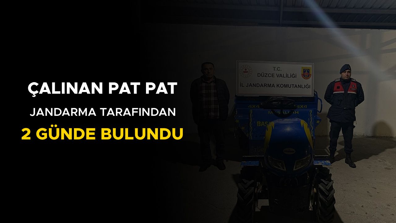 Düzce İl Jandarma Komutanlığı ekipleri, 19 Ekim 2025 tarihinde Gölyaka ilçesinde çalınan ve pat pat adı verilen tarım aracının peşine düştü. Yapılan güvenlik kameraları incelemelerinde pat patı çalan şahıs ile aracın yeri tespit edildi. Yapılan baskında pat pat aracını çalan şahıs yakalanırken, araç ise sahibine teslim edildi. Şüpheli şahıs göz altına alındı.