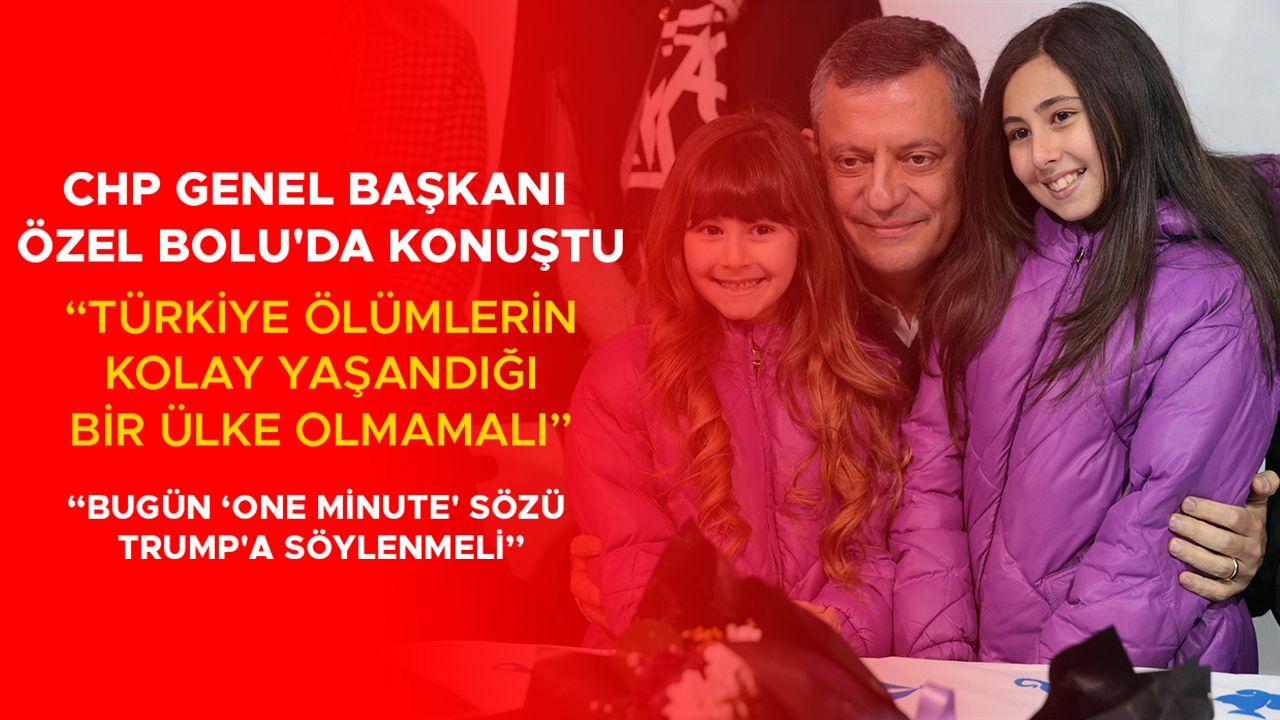 CHP Genel Başkanı Özgür Özel, Bolu Kartalkaya'da 78 kişinin yaşamını yitirdiği otel yangınına ilişkin, "Bunların tekrar etmemesi için, yeni canların yanmaması için bunları unutturmamak ve üzerinde büyük kararlılıkla durmak gerekiyor." dedi. Özel ayrıca ABD Başkanı Donald Trump'ın Gazze ve Filistinliler ile ilgili açıklamalarına tepki göstererek, “Bu açıklamaların normal şartlarda Türkiye Cumhuriyeti hükümetinde oluşturacağı tek duygu infial ve itiraz olmalıdır. ‘One minute' sözünün bugün ABD Başkanı Donald Trump'a söylenmesi gerekir.” ifadelerini kullandı.
