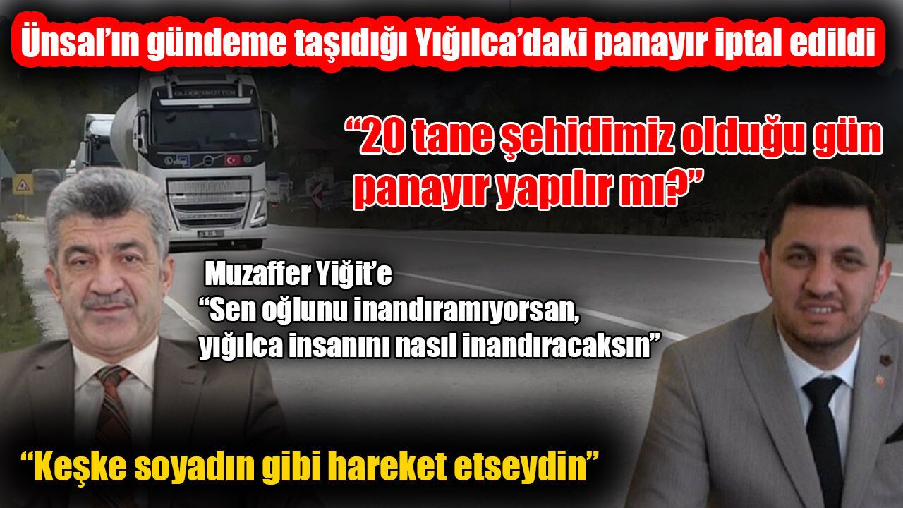 Öncü Medya Genel Yayın Yönetmeni Sadullah Ünsal, Azerbeycan – Gürcistan sınırında düşen C-130 tipi Askeri Kargo Uçağında 20 askeri personelinin şehit düşmesi ve 12 Kasım Düzce depreminin 26. yıldönümünde Yığılca ilçesinde panayır yapma kararı alan Belediye Başkanı Selami Savaş’a sert tepki gösterdi. Ünsal’ın konuyu kendisinin hazırlayıp sunduğu “Yorumlu-Yorum” programında “20 tane şehidimizin olduğu gün panayır yapılır mı? diyerek gündeme taşımasının ardından ise panayır iptal edildi. Ünsal ayrıca, sosyal medya hesabı üzerinden Yığılca Yolu ile ilgili yaptığı paylaşımını bir gün sonra silen ve kendisine ‘Oğlum silmiş’ diyen Yığılca eski Belediye Başkanı Muzaffer Yiğit ile ilgili ise “Sen yazdıklarına oğlunu inandıramıyorsan Yığılca sana nasıl inansın ey Muzaffer Yiğit? Soyadın gibi hareket etseydin keşke” ifadelerini kullandı.