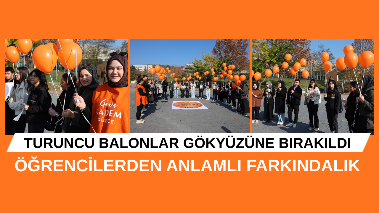 Düzce Üniversitesi 15 Temmuz Demokrasi Meydanı'nda bir araya gelen Düzce Üniversitesi öğrencileri, kadına yönelik şiddete karşı dikkat çekmek ve bilinç oluşturmak amacıyla turuncu balonları gökyüzüne uçurdu.