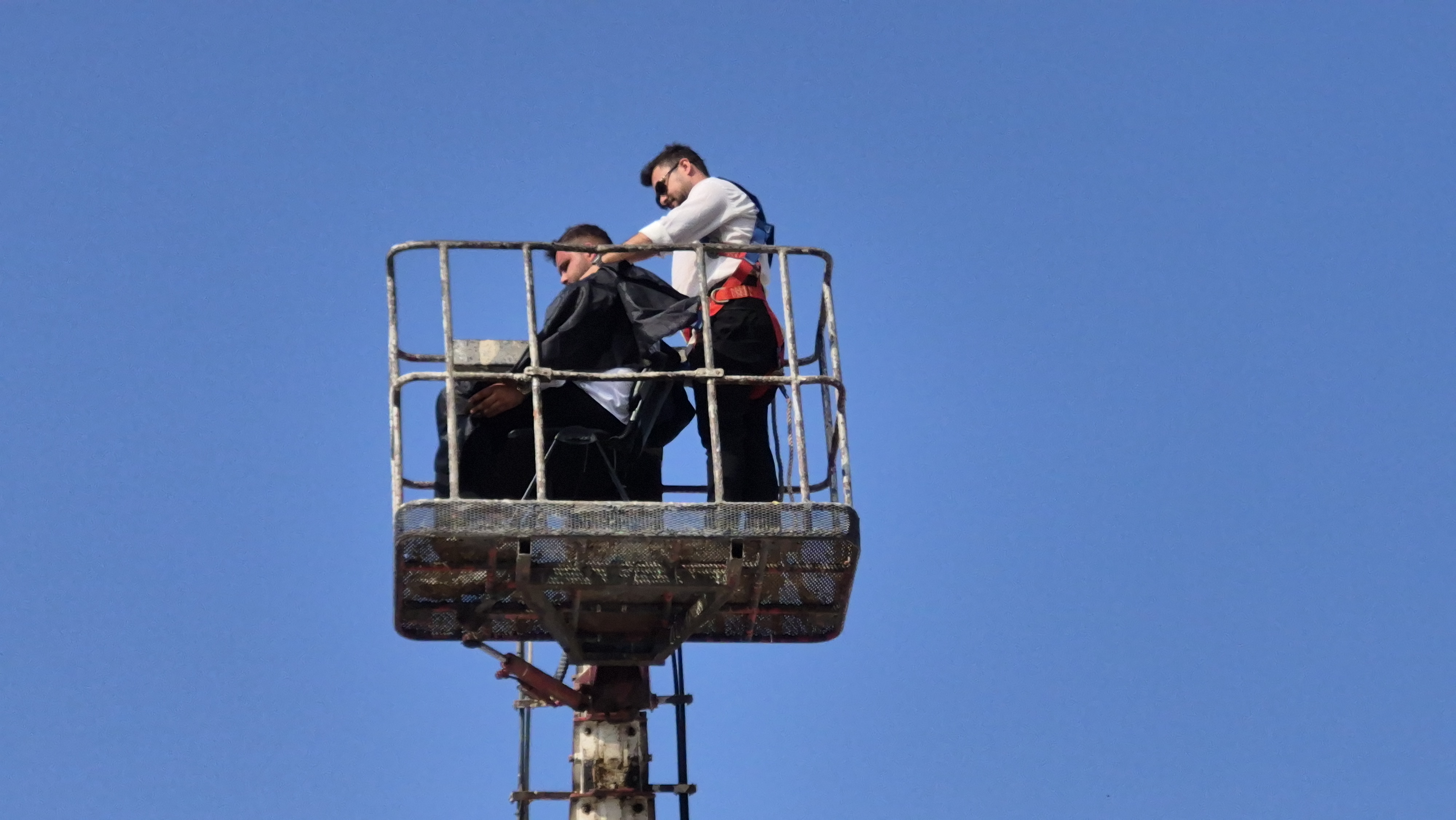 Berber Barış Kahya, yerden 20 metre yukarıda Taner Çelik'i saçlarını makine ve makas kullanarak tıraş etti. Ancak tıraş sırasında zaman zaman şov yapmayı da ihmal etmeyen Barış Kahya, 20 dakika boyunca yaptığı işlem ile Çelik'i saçlarını kesti.