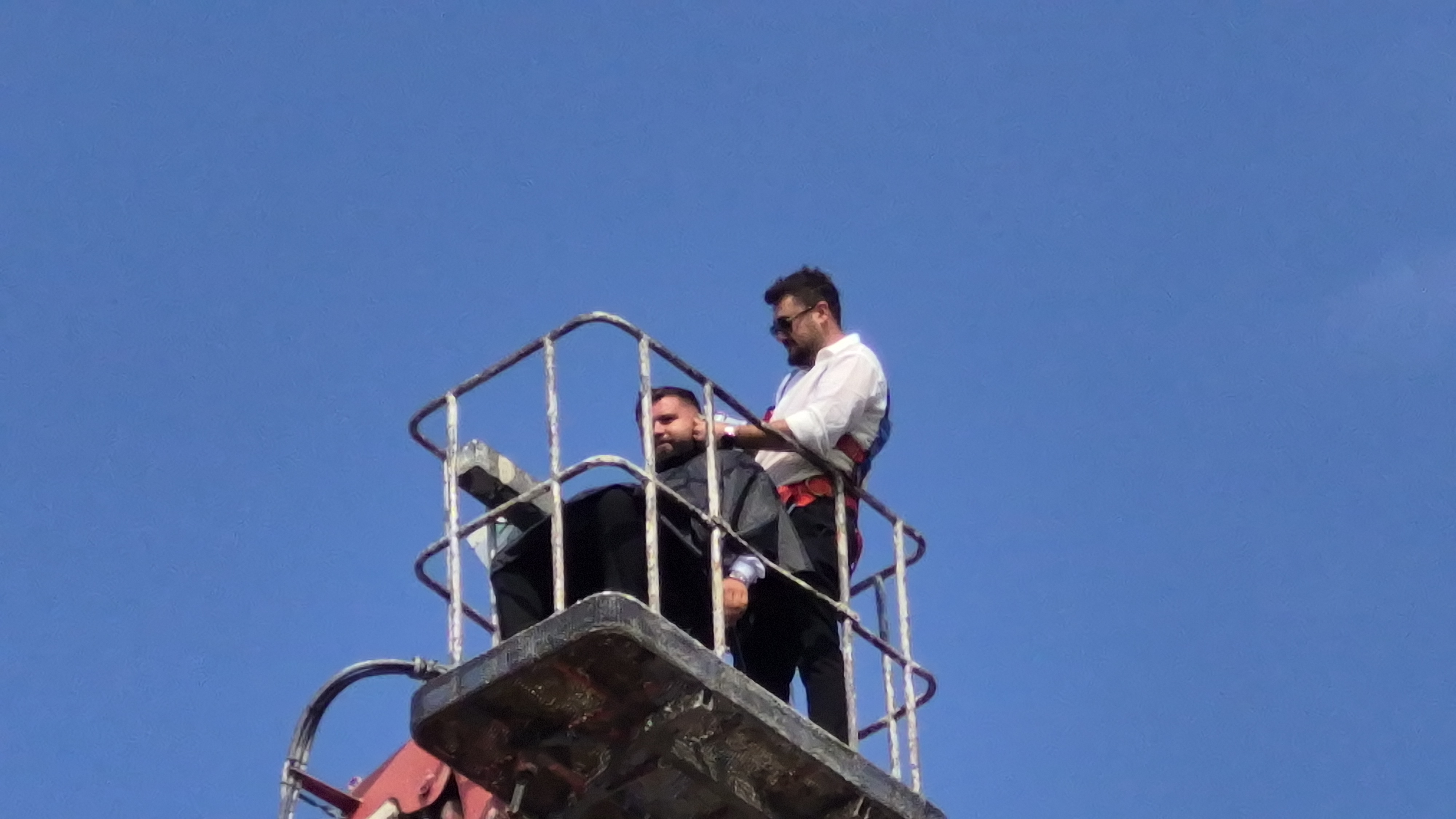 Yerden 20 metre yukarıda tıraş olan Taner Çelik ise yükseklik korkusunun olmasına rağmen gökyüzünde tıraş olduğunu belirterek; “Yüksekte tıraş olmak biraz zordu. İnsanların ilgisini çektik. Yukarıda çok rüzgar var. Benim zaten yükseklik korkum var üzerine de rüzgarlı havada yukarıda tıraş olmak daha çok korkuttu” diye konuştu.