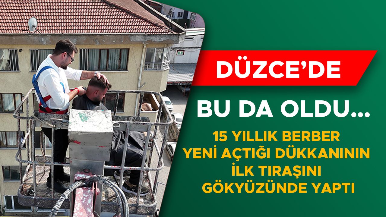 Düzce'de 15 yıldır berberlik yapan ve başka berberlerin yanında çalışan Barış Kahya, kendi dükkanının açtı. Büyük mutluluk yaşayan Barış Kahya ilk tıraşını ise vinç sepeti ile yerden 20 metre yukarıda yaptı.