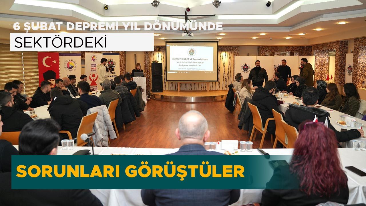 Düzenlenen istişare toplantısına Düzce Ticaret ve Sanayi Odası Yönetim Kurulu Başkanı Erdoğan Bıyık, Yönetim Kurulu Üyesi Ahmet Emin Şen, Meclis Üyesi Metin Şişman, Düzce Belediyesi İmar Müdürü Kalender Aydın, Düzce İl Çevre ve Şehircilik Müdürü Nurhan Kartal, Yapı Denetim Genel Başkanı Nazmi Şahin ve Yapı Denetimi firma yetkilileri katılım sağladı.